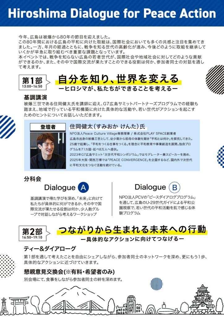 そして、これからのヒロシマからの発信について考え、対話し、参加者一人ひとりが対話(Dialogue)を通じ、未来への一歩を踏み出し、協創しましょう。