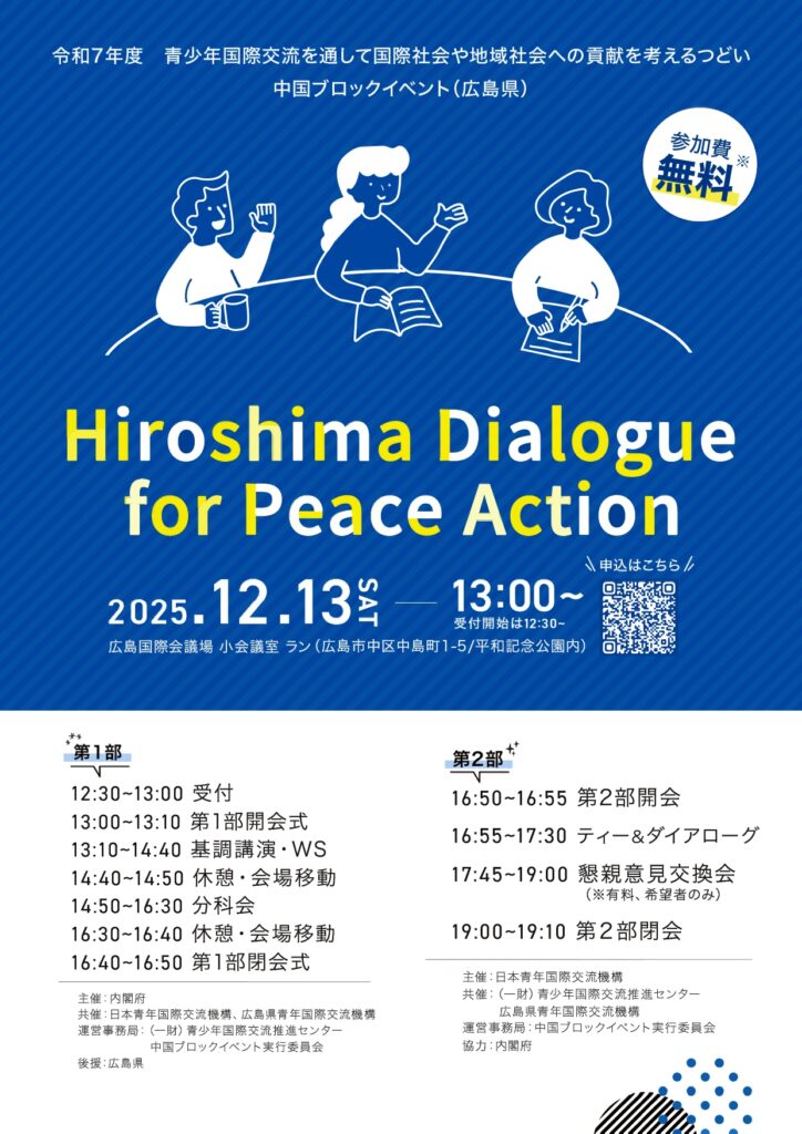 12月13日(土)、広島国際会議場にて、令和7年度青少年国際交流を通して国際社会や地域社会への貢献を考えるつどいを対面開催いたします。